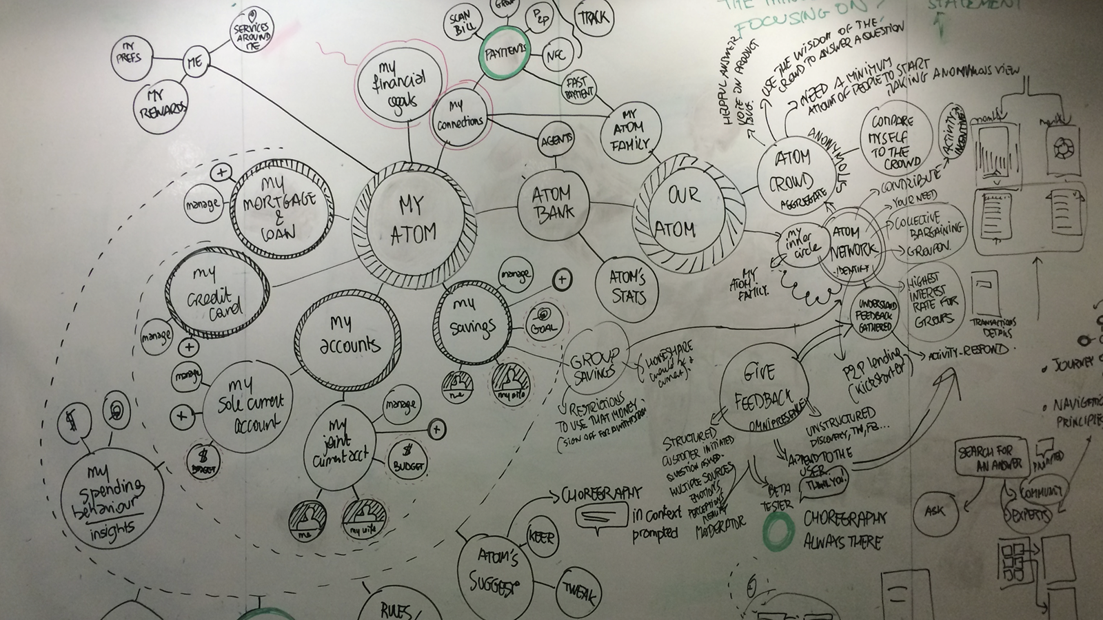 In response, we shifted approach. We asked people to prioritise features by placing them in concentric rings, with themselves at the centre, based on frequency and importance of use. This produced a more flexible, user-shaped information architecture, one that reflected the idea of a truly personal bank, ‘the bank in your pocket’, organised around you.